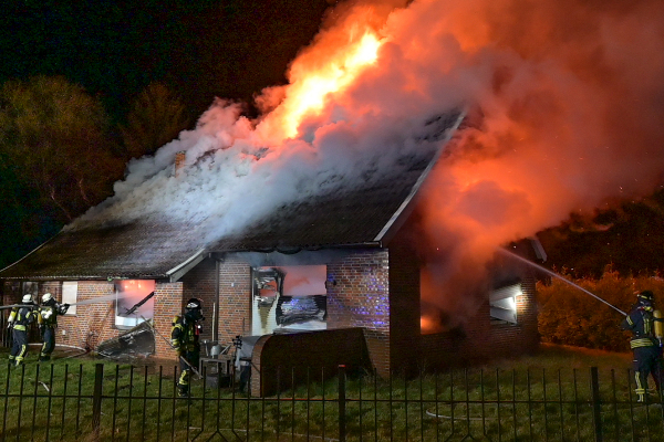 Am Sonntagabend wurden wir unter dem Stichwort „Dachstuhlbrand“ in die Straße Dünebroek in Wymeer gerufen. Beim Eintreffen schlugen bereits die Flammen aus dem Dach, dass Gebäude stand im Vollbrand. Glücklicherweise stellte sich schnell heraus, dass keine Personen im Haus sind. Die Feuerwehr Bunde und Weener (nur Hubrettungsbühne) unterstützten uns bei den Löscharbeiten. Außerdem waren der Rettungsdienst, die Polizei und der Energieversorger im Einsatz. Das Technische Hilfswerk aus Leer übernahm die Sicherung des Gebäudes, nachdem die Löscharbeiten beendet waren