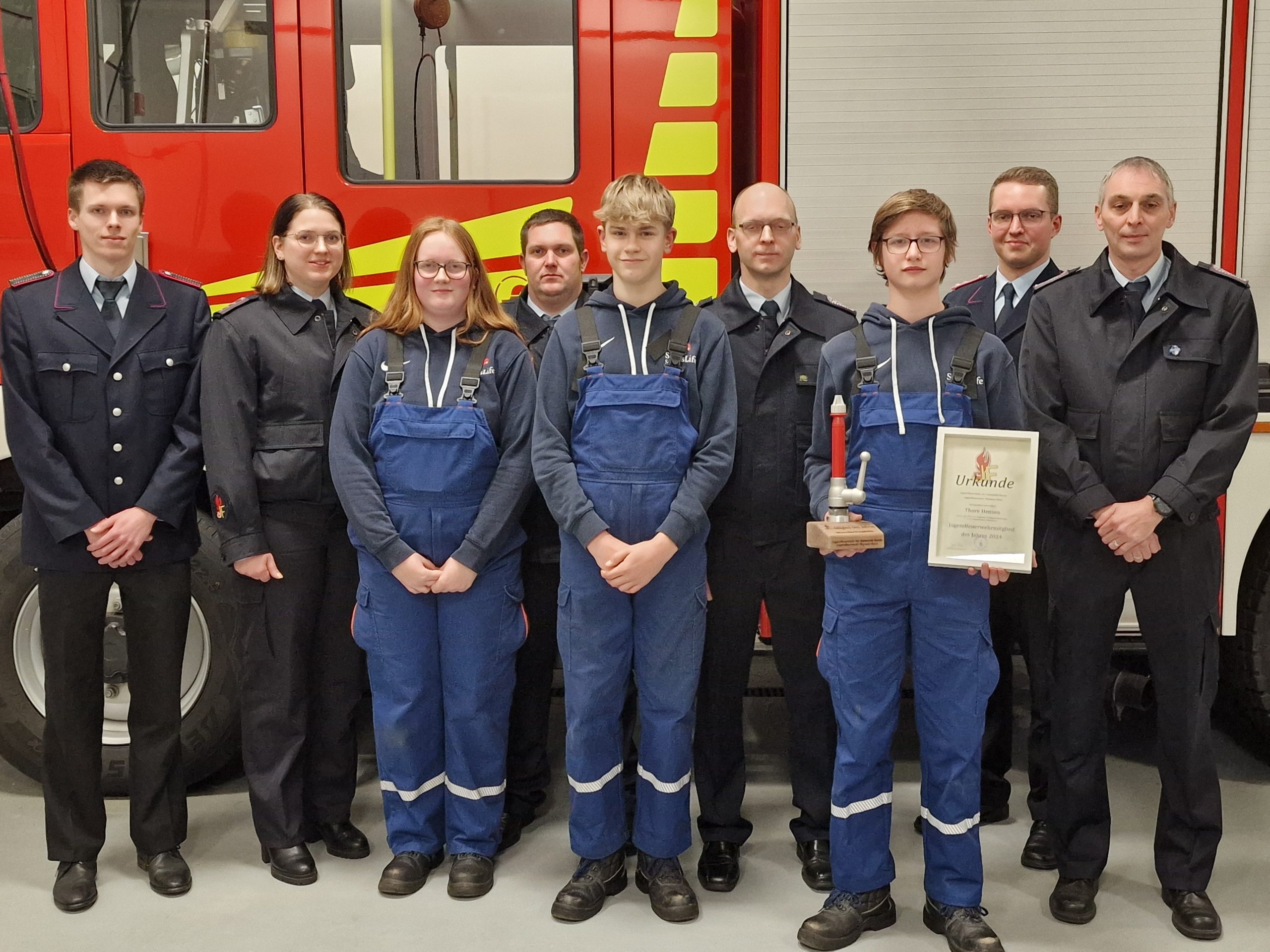 von links: Betreuer Markus Klammert, stellv. JFW Lisa Rose, stellv. Jugendsprecher Fabienne Kaput, Betreuer Ralf van Scharrel, Jugendsprecher Eike Smid, JFW Jens Rose, JFM des Jahres 2024 Thore Hensen, Betreuer Matthias Eiklenborg, Betreuer Jens Aeissen