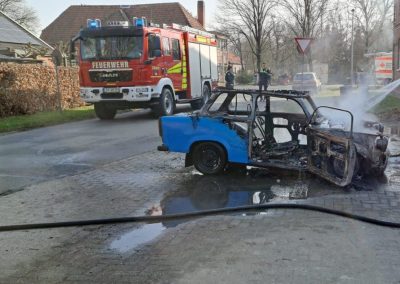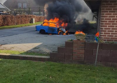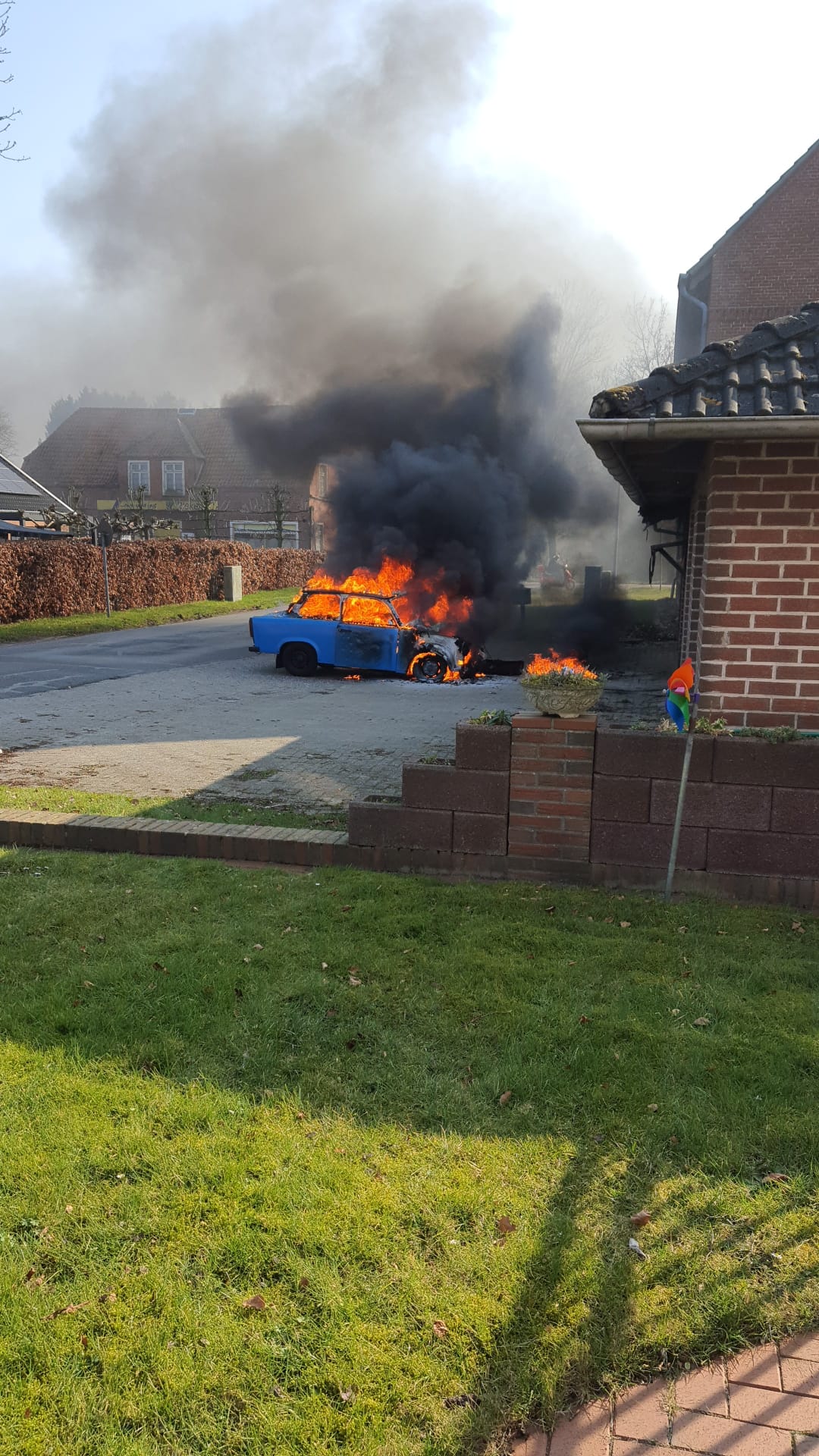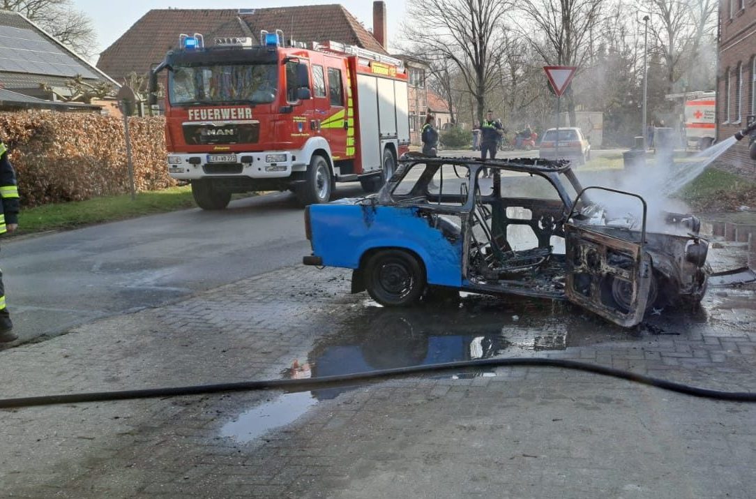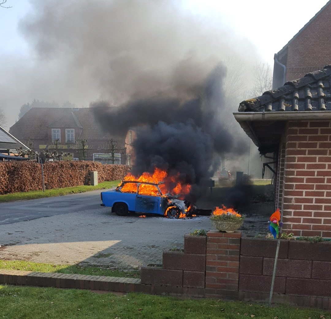 Ein Auto der Marke Trabant ist am Montagnachmittag in Wymeer lichterloh in Brand geraten. Wie Wymeers angehender Ortsbrandmeister Thomas Heyen auf Nachfrage mitteilte, führte der Eigentümer des Fahrzeugs in seinem Schuppen im Swart Weg Reparaturen am Motor des »Trabi« durch. Dabei fing das Fahrzeug plötzlich Feuer. Der Eigentümer konnte seinen »Trabi« noch rechtzeitig aus dem Schuppen schieben, bevor dieser auf der Auffahrt in Vollbrand geriet. Gegen 14.42 Uhr wurde die Wymeester Feuerwehr alarmiert, die sich daraufhin mit zehn Einsatzkräften und zwei Fahrzeugen auf den Weg machte. Nach Angaben von Heyen konnte der Brand zügig gelöscht werden, im Anschluss wurde der Oldtimer noch mit einer Wärmebildkamera auf Glutnester kontrolliert und mit einem Schaumteppich eingesprüht. Danach wurde die Einsatzstelle an die Polizei übergeben. Wie eine Polizei Sprecherin auf Anfrage sagte, zog der 28-jährige Besitzer sich Brandverletzungen an Händen und Unterarmen zu, als er den brennenden »Trabi« aus einer Garage am Swart Weg schob. Er wurde in ein Krankenhaus gebracht. Den Angaben zufolge brach der Brand in dem Auto aus, aus bis lang ungeklärte Ursache während Reparatur arbeiten aus. Der28-Jährige versuchte zunächst, den Brand mit einem Feuerlöscher zu bekämpfen. Er konnte jedoch nicht verhindern, dass das Feuer auf die Garage übergriff. Ein vor der Garage geparkter Pkw wurde durch die Flammen ebenfalls leicht beschädigt. Die alarmierten Einsatzkräfte der Feuerwehr Wymeer konnten das Feuer schnell löschen. Die Polizei schätzt die Höhe des entstandenen Sachschadens auf etwa 10.000Euro.